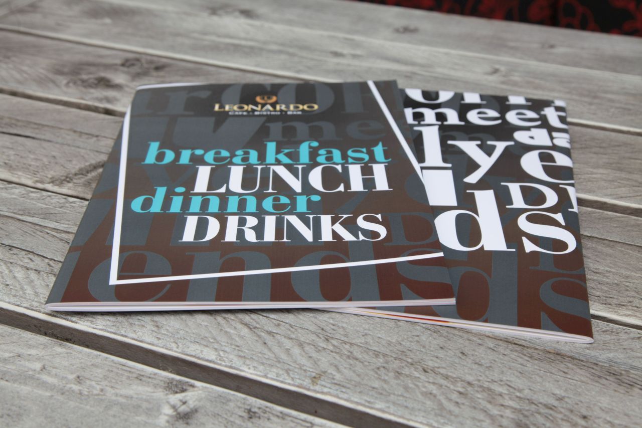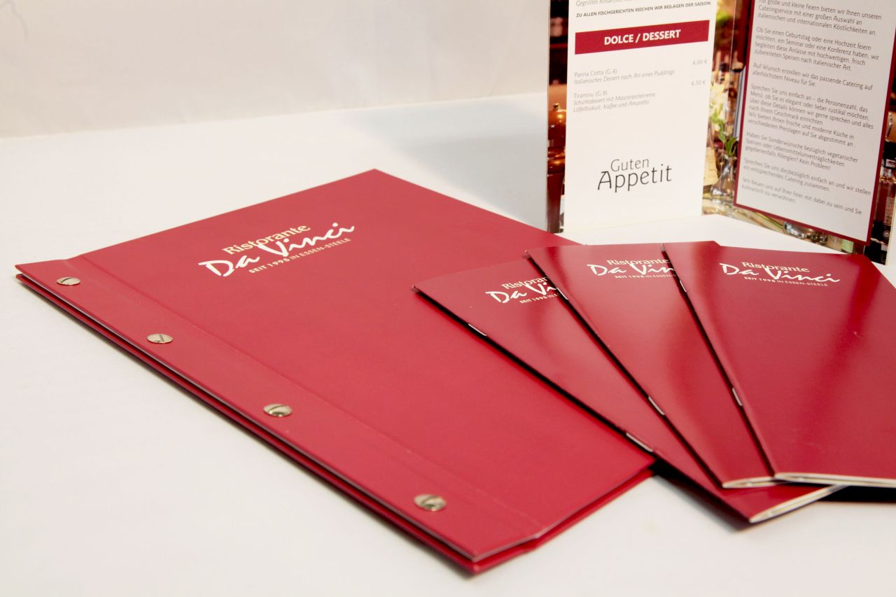 Tischsets, Kellnerblöcke, individuelle Speisen- und Getränkekarten, Fahnen, Sticker, Kugelschreiber, Briefpapiere, Flyer, Broschüren, Schilder, Polos, Hemden, Schürzen und Co.